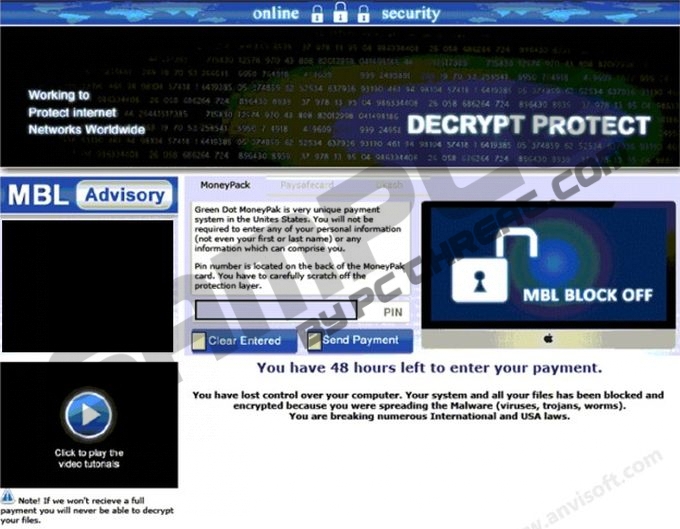 Decrypt Protect virusA lot of computer infections want to make an impression that you have done something illegal and thus your computer access has been restricted. Decrypt Protect Virus is one of such malicious programs. It is distributed by Trojan Reveton and the malware can be categorized as ransomware infection. The meaning behind the name is rather simple - Decrypt Protect virus holds your computer hostage and expects you to pay a 300 USD ransom fee for something you have not committed. Therefore, it presents the same security threats as other Ukash Virus group infections such as FBI MoneyPak Virus or ICSPA Virus. What you have to realize is, however, the fact that if you are infected with Decrypt Protect virus, then it means that you have other infections on your PC as well. That is so, because the ransomware infection is distributed by Trojans and other malware, and you may not even notice how or when the infection takes place. The next thing you know, is that your PC is locked and you are asked to transfer money via Green Dop MoneyPak alternative payment system. The same methods are used by a variety of other Ukash infections, for example, Metropolitan Police Virus or EC3 Europol Virus. Naturally, the fact that you cannot access your desktop can be very disturbing, but even if Decrypt Protect Virus claims that you will be prosecuted if you do not pay the fine within 48 hours, do not panic. This ransomware infection is not concerned with overall online security. It simply wants your money, you should ignore the notification you see on your screen: