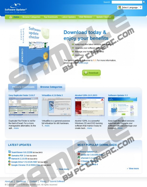 Software Version UpdaterSoftware Version Updater is an application which is installed with various programs that have to be updated regularly. It can be installed alongside free browser browsers extensions and browsers add-ons, which display various coupons and offers. The updates are necessary for the application to run properly, so Software Version Updater search for relevant updates and installs them automatically. Software Version Updater is not a standalone application. It is installed alongside the major application, and the user is partially informed about the installation. In the license agreement, it is usually stated that the application will be updated regularly. If you accidentally install, for example, a browser add-on which displays coupons and offers and want to remove it, it is also important to remove Software Version Updater. The updater is located in the %LOCALAPPDATA% directory as Updater.exe. You can also check your Task Manager and look for the process that has the same name Updater.exe. It has been found that Software Version Updater can be installed by White Smoke, which is a browser toolbar; CouponDropDown, which is a browser add-on that displays various coupons and ads; Search Protect by Conduit, and by many other applications. Do you want to get rid of the unwanted browser application? Do not forget to remove Software Version Updater, which is already flagged as malicious by many computer security applications. The unwanted application creates a registry entry in HKCU\SOFTWARE\Microsoft\Windows\CurrentVersion\Run in order to start running whenever the system starts. What is more, you should keep in mind that after you uninstall only the unwanted browser add-on, Software Version Updater may download the same application and you will again be exposed to, for example, annoying pop-up coupons and third-party advertisements. In order to remove Software Version Updater, implement SpyHunter, which is a highly powerful spyware prevent tool. Install it right now if you want to be sure that you can browse the Internet safely, because it can easily maintain the security of the system. The software will also save your time because it runs automatic system scans, so if you want to be protected by a professional program, SpyHunter is all that you need. | ||||||||||