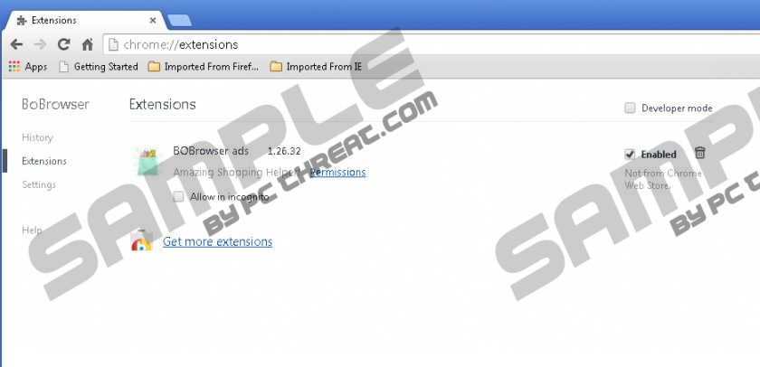 BoBrowserBoBrowser is an application you should not keep on your computer. It is not a malicious infection, but there are particular suspicious aspects you cannot ignore. It is a potentially unwanted application that usually enters target system without user even realizing it. Unless you remove BoBrowser from your computer you could accidentally be exposed to unreliable content. It is very likely that this application has been created to promote commercial content and help adware creators make easy money. Computer security experts recommend remove BoBrowser from your system if you want to ensure computer safety and stability. One of the reasons we cannot say BoBrowser is a dangerous infection is that you can easily download this application at bobrowser.com. It is obviously the main homepage for the application, and it makes it look like BoBrowser is a useful application that can improve your Internet browser experience. It says that BoBrowser includes free antivirus and malware protection, it speeds up your browsing and downloads, all of your information is secured, and it “upgrades your existing browser and keeps all your settings.” It surely sounds like a useful application, but it also exhibits particularly intrusive behavior and it is definitely suspicious. The problem is that users seldom download BoBrowser at the main homepage. It is far more often that this application arrives bundled with freeware. It means that users either download BoBrowser directly from third-party websites, or it comes with third-party installers that carry more than just one unwanted application. According to our research, this program may come with such potential threats as MySafeProxy, SpeedChecker, Snap.do and other apps. In other words, BoBrowser may function as a rather decent indicator, telling you that you have more unwanted programs installed on your computer. The best way to determine those programs is to run a full system scan with a reliable antispyware tool. BoBrowser itself functions as an internet browser. It is developed by CLARALABSOFTWARE. When it comes bundled with freeware, the moment BoBrowser gets installed onto your computer; it automatically sets itself as your default browser. The program also starts together with Windows and displays constant advertisements. Some users may think that BoBrowser is a Google Chrome extension, but the application is created like that on purpose – it looks identical to Chrome, and thus it confuses people. There is no need to keep this unreliable program on your computer. Luckily, it is easy to remove via Control panel, and that is exactly what you should do right now. To protect your computer from other similar threats, invest in a powerful antispyware tool, and run regular PC scans with it. How to remove BoBrowserWindows 8