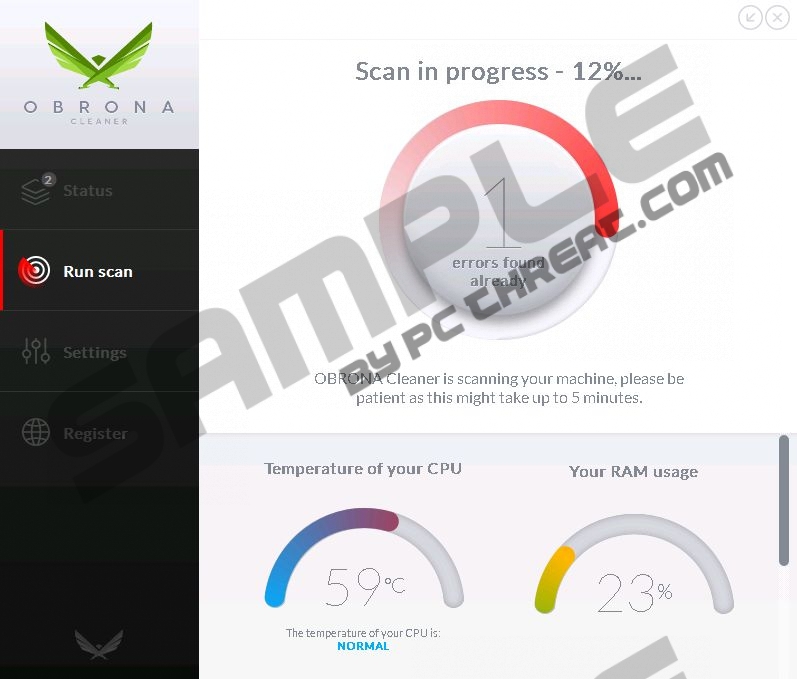 Obrona CleanerObrona Cleaner is a suspicious application that we identify as a PUP (or potentially unwanted program). Our malware analysts have found that users must delete this application, because it does not work the way it is supposed to. If you do not remove Obrona Cleaner scanner, it will keep prompting you with unreliable reports suggesting that there are many high-level security threats that you must remove from your PC. In reality, the threat that you need to delete is the PUP itself. Some users download Obrona Cleaner from cleaner.obrona.org, but many acquire the application unintentionally with software bundles. Unfortunately, it appears that the PUP could be spread using malicious installers, which means that Obrona Cleaner could be installed with malware. Needless to say, it is crucial to delete malicious programs from your operating system. Even though you should delete Obrona Cleaner from your operating system as well, the removal of malicious programs – if they are installed with the PUP – should be your priority. When installed, Obrona Cleaner adds tasks to the Windows Task Scheduler to avoid the detection of the Windows User Account Control, which can aggravate the eventual removal. It is disconcerting that this program can bypass security notifications, because this is the kind of activity that we would link to malware. Unfortunately, this is not something computer users think about after they hear a loud alarm and encounter an intimidating scanner report presented by Obrona Cleaner. Here is an example.