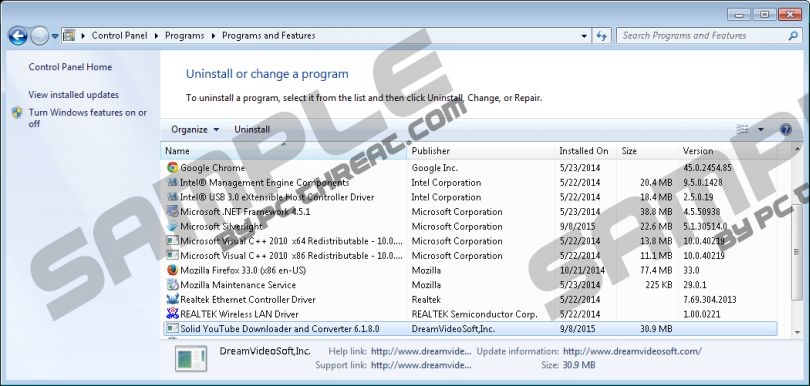 Solid YouTube Downloader and ConverterSolid YouTube Downloader and Converter is a program that allows Windows users to download videos from youtube.com. Whether intentionally or not, this program supports illegal activity, as most of the videos found on this site are copyrighted. Although we do not condone this activity, this is not what we are concerned about. It is far more concerning that this potentially unwanted program can inject advertisements, because any of them could route you to unreliable sites. Even if this is the only reason to remove Solid YouTube Downloader and Converter from your computer, you should not dismiss it. Topvideosoft.com/youtube-downloader-and-converter.html is the official download page representing Solid YouTube Downloader and Converter. Topvideosoft.com also promotes Solid MP4 Video Converter, Solid iPod Video Converter, and Solid Video Converter Ultimate. Since all of these PUPs can inject ads, we do not recommend installing any of them. On the contrary, we advise removing these programs. The worst thing you could do is pay for Solid YouTube Downloader and Converter. The licensed version of this program costs $39.95, and no discount is low enough because it is not worth any money. If you decide that you want to remove this program after investing in it, you might be able to get a refund – if you make this decision within 30 days. DreamVideoSoft,Inc. is the creator of Solid YouTube Downloader and Converter, and most users are not familiar with this company. Chances are that it did not create potentially unreliable programs in the past, or it is a new company. Although this company does not mention advertising, the Privacy Policy at topvideosoft.com/privacy-policy.html discloses that you grant permission to display third-party ads and offers if you install Solid YouTube Downloader and Converter. If you do not delete this PUP, ads might show up without any warning. The parties that could serve ads are undisclosed, which makes them unpredictable, and this is why we recommend removing the PUP. The main purpose of Solid YouTube Downloader and Converter is to get your money. Even if you install the free trial version, you will not be able to use it to download and convert videos. If you try, you will be warned that only half of the selected video will be processed. This is meant to push you into purchasing the full version of a truly questionable program. As mentioned previously, Solid YouTube Downloader and Converter could be used to download copyrighted material – which is against the law – and it can show ads, which is why you should remove this program instead of investing in it. We can show you how to remove it. If you have downloaded Solid YouTube Downloader and Converter bundled with third-party programs, you have to analyze them using a malware scanner. If you discover that these programs are unreliable, delete them as soon as possible. We recommend that you delete them along with the PUP, and it is easiest to install an automated malware remover to clean your operating system. If you scan your PC and learn that the removal of Solid YouTube Downloader and Converter is your only worry, follow the instructions below. Of course, you should install a security tool afterward to ensure that PUPs do not enter in the future. Solid YouTube Downloader and Converter RemovalDelete from Windows 10, Windows 8.1, or Windows 8: