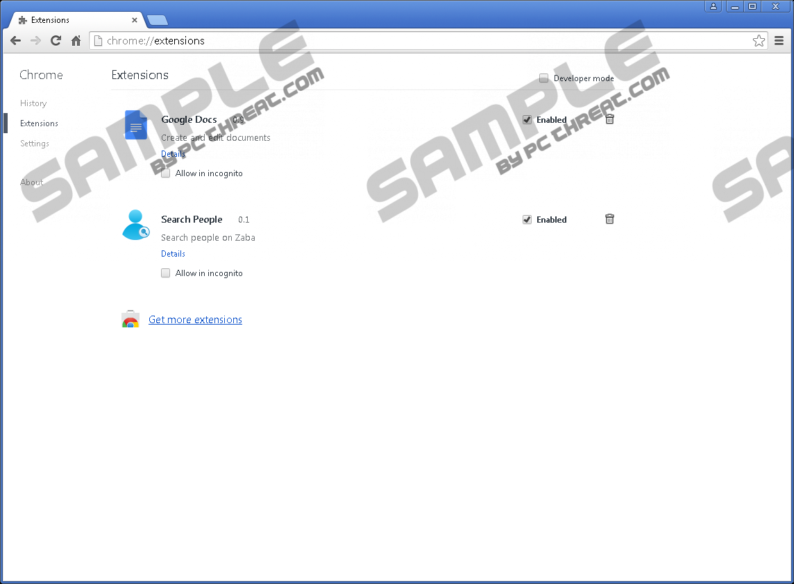 Search PeoplePerhaps you would like to have most of your acquaintances at your fingertips, and Search People looks like a program that could help you do that. However, you should think twice before you install this extension on your browser because our security experts say Search People is a potentially unwanted program. When a program falls into this category, it means that it could be associated with specific security issues or installed on your computer without your permission. Whichever it might be, it would be for the best to remove Search People from your system immediately because you can never foresee the potential side effects. Unlike most of the potentially unwanted programs, Search People affects only the Google Chrome browser. This application is a browser extension, and it can be downloaded from the Chrome Web Store. This definitely works in favor of the program because when an application is available at the Chrome Web Store, it looks like the app is useful and reliable. Nevertheless, you will do yourself a favor if you go through the user reviews presented on the Chrome website. From the user reviews, you will see that they are very dissatisfied with the application, and most of them have trouble removing it. On top of that, judging from the reviews, most of the users do not even know how Search People entered their computer because they claim they have not downloaded it from the Chrome Web Store. This suggests that the application gets distributed via other methods as well. For instance, Search People might come in a software package via file-sharing websites. Thus, there is a good chance that you can get infected with this application when you download some freeware apps on a daily basis. This also means that it is possible to avoid installing potentially unwanted and dangerous applications as long as you are responsible for the websites you visit and the programs you download. Our research and the user reviews at the Chrome Web Store suggest that Search People is an extremely annoying application that can interfere with your web browsing process. It will launch a search window in the bottom left corner of your browser, and it will use a search engine that has nothing to do with your default search provider. From our tests, we have found that Search People employs the zabasearch.com search engine. Since this is a third-party search engine that has not been certified by reliable security applications, it would be unwise to enter any search queries into it. All in all, you should remove Search People because the application clearly comes uninvited. Also, if you encounter the extension in the Chrome Web Store, you should read the user reviews before installing it. Luckily, it is possible to get rid of this application by removing it with the Chrome extensions manager. If you think that there might be more unwanted applications on your system, you should seriously consider scanning the PC with the SpyHunter free scanner. This way you will be able to determine what programs should be terminated at once. Should you encounter any difficulties while trying to delete Search People, do not hesitate to leave us a comment. However, you should also invest in a legitimate antispyware tool that would keep your system protected from similar intruders in the future. How to Remove Search People