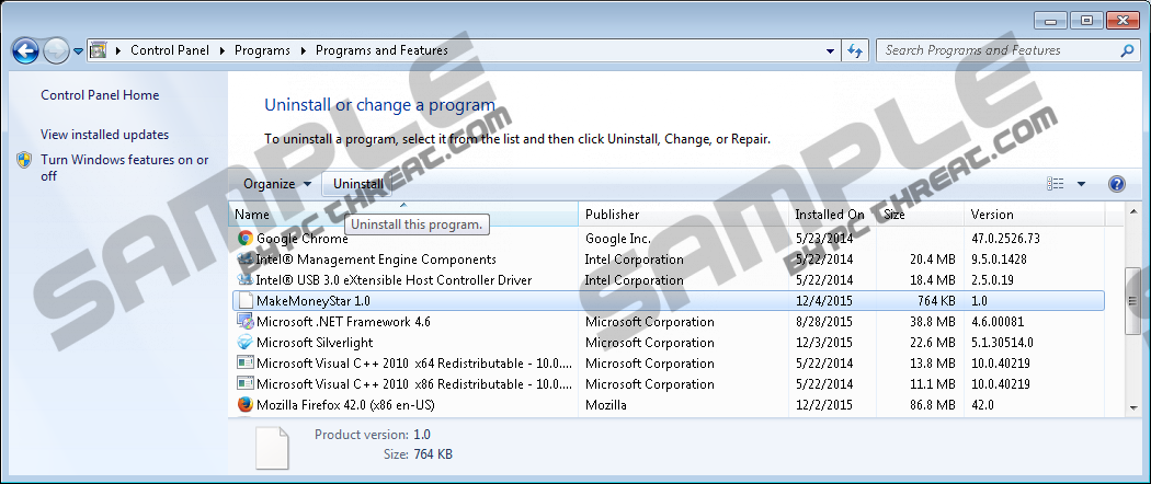 MakeMoneyStarPerhaps you believed that MakeMoneyStar will help you get extra money online, or you downloaded the application without even realizing it. At any case, it is advisable to remove the software as it might display content that is dangerous to your computer. Our researchers tested the application and identified it as a potentially unwanted program (PUP). Apparently, the program should display various ads and shopping offers. The bad news is that some parts of the ads could be from untrustworthy third-party partners. Usually, developers that create such applications do not review the content of third-party web pages, so some of them could be malicious. Although the program will show you legitimate sites from time to time, it would be better not to risk your computer’s safety and get rid of the PUP as soon as possible. If you scroll to the bottom of the page, you will find the removal instructions. We learned that users can download the PUP from its official site (makemoneystar.com). If you happened to download MakeMoneyStar from there too, you should be aware that the provided installer could have been bundled with unreliable software. For instance, it could contain suggestions for other potentially unwanted programs, adware or browser hijackers. If you noticed other unusual activities on your computer, you should check if the mentioned threats managed to settle in. Nevertheless, MakeMoneyStar has other ways to enter your system. For example, it could be available on untrustworthy file-sharing websites. Perhaps you did not see the application being promoted there, but it may have been bundled with other freeware. Bundled installers suggest additional software, which user can choose to either accept or reject. However, if you do not pay attention to the information provided by the setup wizard, you might install unwanted applications like the PUP unknowingly. When you launch the application for the first time, it should open a window with the MakeMoneyStar logo on the top-left corner, and it should load sites, such as savings-galleria.com, redtag-specials.com, and many others. We should also mention that the program can open a new browser window and load sites with surveys, shopping, and casino offers, etc. If you open the PUP later, it should act the same. As we said before, the web pages could be legitimate and safe to browse, but some of them could come from unreliable sources. MakeMoneyStar could redirect you to third-party websites that advertise browser hijackers, adware, different PUPs or other suspicious software. These applications might have exaggerated descriptions, so they could look useful despite that they may be potentially harmful. Another reason you should avoid websites displayed by the PUP is that they could contain malware, e.g. Trojans, viruses, and so on, although malicious or unreliable software is only one bad outcome of many others. For instance, third-party sites could gather sensitive information of yours, such as email address or data related to your banking account. This information could be used for cyber fraud, so you should keep it protected no matter what. All things considered, MakeMoneyStar seems to be just another potentially unwanted program that advertises unreliable sites. Probably, it was created to generate advertising revenue from your clicks for its developers. If you realize what threats await you on third-party sites, it should be clear that it is you who will not get anything beneficial from this scheme. The good news is that we can offer you a rather simple way to eliminate the PUP if you choose to delete it from your system. It seems that the application can be removed through Control Panel. If you launch a particular option, you can get rid of the PUP quickly. For those who do not know how to open Control Panel, we prepared a removal guide at the end of the article. In fact, we can offer you another way to erase the application. You could download a reliable security tool that would find and delete the MakeMoneyStar for you. All you have to do is to install the antimalware tool, scan your system with it, and wait till it presents automatic removal option for you. Delete MakeMoneyStar through Control PanelWindows 8\Windows 10