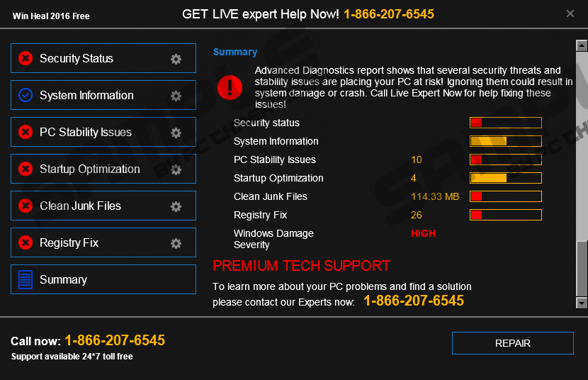 Win Heal 2016Win Heal 2016 is supposed to be a system scanner that reports issues detected on your computer. However, even though the application’s window provides the “Repair” button, the software does not clean the system after clicking it. Instead, you receive a message to contact the support members via given telephone number. Our specialists did not try to call it themselves, but they believe that the person who answers could try to sell users another version of Win Heal 2016. What’s more, the software falls under the category or potentially unwanted programs (PUP). Apparently, it has a few undesirable qualities that might make its users regret installing the application. If you are one of the users who would like to get rid of it, there is a removal guide available at the end of the article, although we encourage you to read the text first. To begin with, it is crucial to understand how such PUPs are distributed since some of the users might install it unknowingly. The application could be spread with bundled installers. Such files may be distributed through various file-sharing web pages. Often bundled installers suggest a couple of other programs in addition to the main one. Usually, you can easily deselect these offers, but some users fail to notice them. If it happened to you as well, you should be more attentive the next time you launch a setup file. The PUP has a couple of unwanted qualities that could annoy its users. For instance, the software manages to auto-start with the operating system whether you like it or not. It happens because the application places a value name called WinHeal on the Run key in the Windows Registry. Thus, if you want to stop Win Heal 2016 from launching itself automatically, you should erase the mentioned entry. To make things worse, users might find it difficult to close the application’s window. When you click the X button, the PUP disappears from the screen, but it goes to the background, and the software’s icon appears on the Windows taskbar. If you right-click the icon to shut down the program, its window appears on the screen again. At this point, if nothing helps, you should use the Task Manager and kill the program’s process. Furthermore, after Win Heal 2016 scans the computer, it might advise the user to call their “live expert.” Also, the same message could be displayed once you click the “Repair” button. From what the message says this person from support should tell you more about the issues on the system and provide you with the solution. Based on the behavior of other similar applications, it could be that the support member might try to sell you either another version of Win Heal 2016 or different tools. Sadly, as the detected issues could be fake, buying suggested products or services might be a waste of your money. Our specialists think that the report may display issues, which do not exist because the application only shows how many issues it detected and what they are related to. To ensure that these issues are not fake the PUP should list the data related to the detections and specify where such files were found. Then the user could check these files and if needed remove them himself since the tool does not clean the system. This also could make one question the usefulness of the software. If it does not give you any benefits, why keep it on the computer? Especially, if its automatic launch or urges to contact the support annoys you. Users who want to clean the system and do not mind to spend their money on useful tools should get a trustworthy antimalware tool instead. It would help you guard the computer against malware. Plus, you could use it to scan the system or specific files and eliminate detected threats. Therefore, if you do not trust Win Heal 2016 and want to remove it, you can erase it with the legitimate antimalware tool of your choice. There is also another method to get rid of the software. Users can locate and delete the PUP’s created data on the system manually. If you do not know where to start, the step by step instructions available below should help you with the task. Plus, users can write us a comment here or reach us through social media, if they need further assistance or want to ask a couple of questions about the application. Erase Win Heal 2016