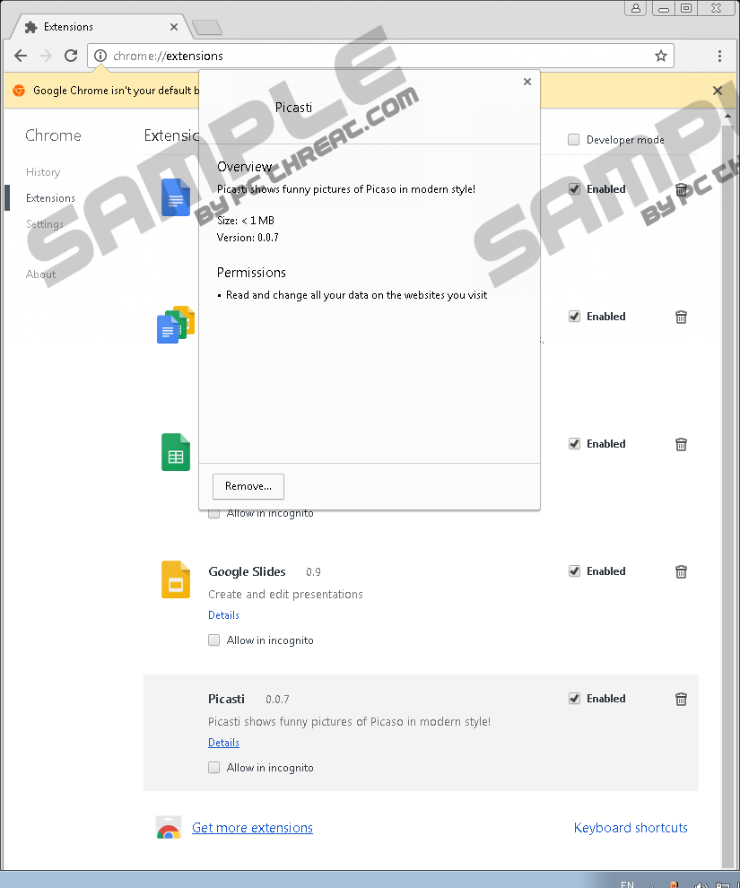 Picasti ExtensionPicasti Extension is an unreliable Google Chrome browser extension that may show up on your system under questionable conditions. As a matter of fact, its official channel, the Chrome web store has already blocked and removed this extension, which obviously indicates that there are certain reliability issues with this tool. We have labeled this browser extension as a potentially unwanted program, or PUP in short, even though it is also possible that it exhibits advertising-supported traits as well. If you are a security-minded computer user, this PUP would be totally useless to you even if it actually worked. However, we have found that this extension has stopped functioning, too. If you want to keep your system healthy and protected, we suggest that you remove Picasti Extension as soon as possible. Our research shows that there is no official website that promotes this risky browser extension. In fact, even the only official source, the Chrome web store has blocked it. Formerly, this PUP was available at chrome.google.com/webstore/detail/picasti/mhgcdjhdeoinadoehjnbfnddbeniklkf, but now there is only an error page that greets you there. But it is still possible that previously you installed this extension through this channel. We would like to point out that all Chrome extensions have a unique ID, in this case, “mhgcdjhdeoinadoehjnbfnddbeniklkf,” which you can find at the end of the URL or in the Extensions settings of your Google Chrome browser if you tick the “Developer mode” checkbox at the top. It is quite useful to always run a web search on this ID because you may find out the true face of a tool. Although we are talking about a no longer working browser extension, you may still find a few articles on how to delete Picasti Extension from your browser. This should help you decide whether an application is reliable or not. Another thing you should always consider is the rights you give to an extension when you install it. There is always a pop-up window that tells you about these rights. In this case, you would see “Read and change all your data on the websites you visit.” Do you think it is reasonable to give such rights to an unreliable tool? Please, always make sure you are aware of the permissions you are about to give to programs on your system. As a matter of fact, it is not even too likely that you installed this PUP in this way because there is a way more questionable channel through which it can be distributed: freeware bundles. You may download and install this annoying PUP via malicious software packages that can enter your system after you click on corrupt third-party advertisements. This is one of the reasons why you should make sure that there are no malware infections on your system at all, because even one single adware program can generate such ads. Another way for you to be introduced to harmful third-party ads is to visit suspicious torrent and freeware websites. All in all, if your system is infected with this PUP, you should inspect your computer with a reliable malware scanner right after you delete Picasti Extension. This questionable Chrome browser extension used to promote itself as a tool that "shows funny pictures of Picaso in modern style" whatever this really means, not to mention the spelling mistake in Picasso’s name. To be quite frank, it does not even matter anymore what kind of function this PUP ever offered because it seems to have stopped working recently. However, our tests show that it is possible that this tool might also be used to display third-party ads through your browser. While many users are not aware of the potential risks such ads may hold, we must tell you that clicking on unreliable ads that could come from this PUP would put your virtual security at risk. You might end up on malicious websites or drop further infections onto your system. Hopefully, you are convinced now to know what to do with this extension. We advise you to remove Picasti Extension if you want to do something good for a more secure system. Fortunately, it is not at all difficult to put an end to this useless PUP. You simply need to locate the extension in your Google Chrome browser settings and remove it. Since there is a chance that you have not done this before, we have included easy-to-follow instructions below. You can delete Picasti Extension from your browser in a minute even if you are not an experienced computer user. Since this could be the least dangerous threat on your system, we suggest that you go on detecting other questionable and malicious programs until your computer is totally clean. If you do not want to do this manually and would like to have proper defense against all kinds of malware attacks, we recommend that you install a trustworthy application, such as SpyHunter. But do not forget about the importance of keeping all your programs and drivers updated from official sources either. How to remove Picasti Extension from browserGoogle Chrome