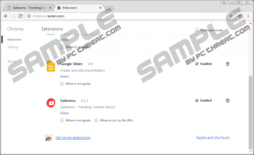 SadoomaObviously, there are computer users who like to follow trending and viral stories on the web and would not mind a browser extension like Sadooma to present them with such content at the click of a button. However, our research and tests indicate that if you find this tool in your Google Chrome browser, it is quite likely that you do not recall installing it or that you installed it along with malicious programs entering your system all together. Since this browser extension does not mean direct threat to your system security and cannot be called dangerous anyway, we have labeled it as a potentially unwanted program (PUP). But even though it may appear and sound to be an innocent addition to your browser, it may still expose you to potentially unreliable third-party web content, for example. We do believe that you would be safer in your virtual world without this PUP in your browser. Therefore, we recommend that you remove Sadooma if your virtual security matters to you. But before you make up your mind about this useless extension, let us tell you more about it so that you understand our verdict better. There are two official sources for you to install this PUP directly. One is the promotional website at sadooma.com and the other one is the Chrome web store at chrome.google.com/webstore/detail/sadooma/bjpgbdljdofdhggmpkmmbpefplpdopdc. You should know that whenever you add an extension directly, there is a pop-up window that tells you about the permissions you are about to give to your target tool. In this case, you let this PUP "read and change all your data on the websites you visit and change your search settings to search.sadooma.com." If you hastily click on the "Add extension" button, you may miss this vital information and wonder afterwards why your web searches end up on this questionable search engine and get redirected to another one, too. But the truth is, we do not think that too many users would find these channels and install this PUP intentionally. In fact, the statistics show mere 132 downloads so far, which is really nothing and just makes you want to delete Sadooma right away. The bigger issue you may be facing is when you install this browser extension under questionable conditions. Our research shows that this PUP can be installed by clicking on corrupt third-party advertisements, such as pop-ups. However, when this happens, you may not even realize that this tool has been added to your Google Chrome browser. What's more, it is quite possible that you download a whole bundle of malicious software installers that contains this tool as well. You can be introduced to such unsafe third-party ads when an adware program is hiding on your computer and keeps flooding your screen with ads whenever you go online. Another possibility is that you land on shady websites that promote a lot of third-party contents, including gaming, gambling, porn, torrent, and shareware pages. If you are not familiar with the page you end up on, there is a good chance that you click on the wrong content and drop a malicious package onto your system. If you have installed a free program or a bundle lately, chances are you got infected with this PUP this way. We suggest that you remove Sadooma and inspect your computer with a proper malware scanner to find other harmful programs as well that may be threatening your virtual security. When you are installing this PUP, you will see a warning from Google popping up in the bottom-right corner of your screen informing you that Sadooma "will launch at system start up" and will continue to operate in the background even after all Google Chrome windows are closed. Well, this is a bit worrisome considering that god knows what this tool is doing in the background when you are not using your browser. We have found that this browser extension comes from the same creators who are also responsible for an adware program called Baboom. The difference though is that this PUP does not directly show third-party advertisements but it changes your browser settings to set your default search provider to search.sadooma.com. However, you need to know that this search engine is not necessarily reliable as it may change search results to include affiliates' links. This search engine redirects your queries to a Yahoo search results page whenever you enter your keywords in the address bar. Exposing you to questionable and potentially unreliable search results is another reason why you should delete Sadooma from your computer without hesitation. This PUP offers you "trending content search." In fact, it appears as a tiny icon in the top-right corner of your browser window. If you click this icon, a pop-up opens with three supposedly trending or viral articles that lead to viralnova.com. This website is filled with questionable third-party ads so you need to be very careful where you click if you do not want to end up on malicious websites or drop further infections onto your machine. Furthermore, there is also a search box at the bottom of this pop-up window that will also use search.sadooma.com and redirect to Yahoo; in other words, a totally useless and unnecessary tool since you could simply use your browser's built-in functions, which is a lot safer and less hassle. All in all, we recommend that you remove Sadooma as soon as you can. The easiest way for you to put an end to the operation of this PUP is to remove this extension from your Google Chrome browser. It seems that right now only this browser is affected by it but it is possible that in the future this changes. If you do not know how to get rid of this useless extension, please use our instructions below. When you finish, you will be redirected to a good-bye page, sadooma.com/uninstall.php, which signals that you have succeeded. We suggest that you do not stop at this point because there could be more dangerous infections on board. If you do not want to hunt them down manually, we advise you to use a professiona