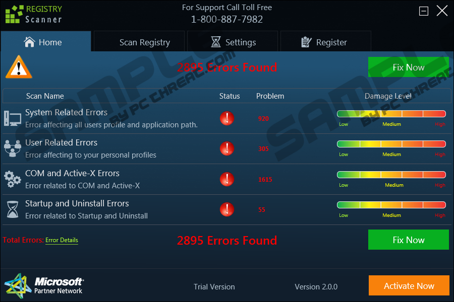 This program’s website claims that it has more than 10, 000, 00 users which is pretty far-fetched . The current version is 2.0, and it was last updated in March 2017. However, all those updates have not this program any better. Our research has shown that this application performs a fake scan of a computer and then claims that the Windows registry is damaged and that you need to fix them. Again, we want to state that the scan if fake as this program points to non-existent registry keys. Moreover, this unreliable program might delete good registry keys which might cause some of your programs not to work properly. Therefore, purchasing it for the $7 USD is a waste of money even though it does not cost that much. You can get a much better application for free, but we want to note that a registry cleaner does not impact a computer’s performance significantly. Furthermore, we want to point out that this program promotes a tech support phone number 1-800-887-7982. We do not know whether this number is actually tech support, but we assume that it is no good given the shady origins of this program. The techies on the other end of the line might encourage you to buy the full version of Lishbos Registry Scanner.