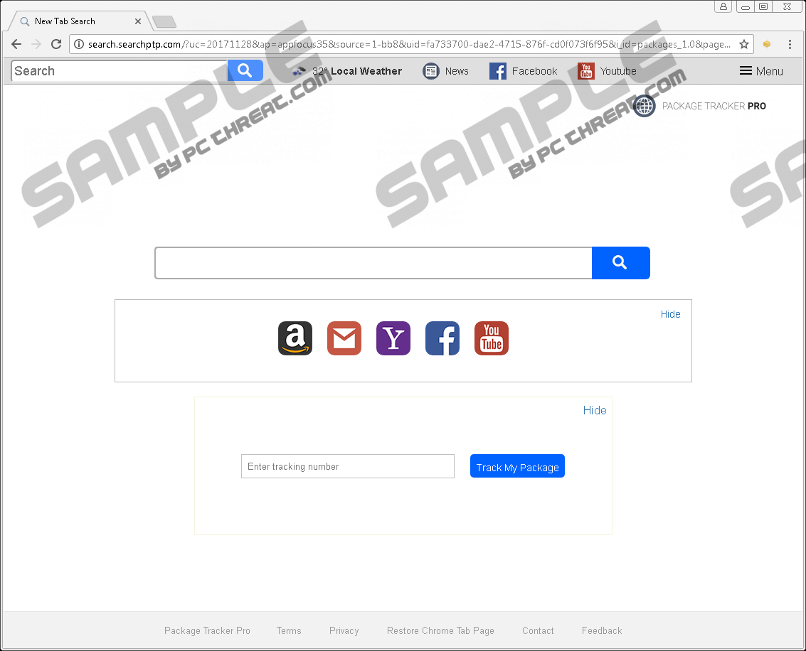 Package Tracker ProIf you find Package Tracker Pro in your browsers, it is possible that you did not install it knowingly. Although this browser extension may appear to be useful for those who receive or send FedEx, UPS, and USPS packages frequently, we believe that this tool may pose a threat to your system security. We have found that this potentially unwanted program (PUP) is an exact clone of Search.hfastpackagetracker.co and both belongs to the Polarity family. You can also think of this tool as a browser hijacker due to its capability to change your browser settings. This PUP can affect your Google Chrome, Mozilla Firefox, and Internet Explorer browsers so if you prefer to use any of these browsers, you could always be exposed to this questionable search page. We do not encourage you to use this tool because you could be presented with unsafe third-party content and cause further virtual security issues for you. We suggest that you remove Package Tracker Pro from your PC as soon as you can. Please read on to find out how you can avoid similar threats. In all fairness, first we need to mention the official channels where you can directly install this questionable browser extension. The official page can be found at packagetrackerpro.com, which is the usual simple page with limited information. The other one is the Chrome web store, chrome.google.com/webstore/detail/package-tracker-pro/kbdgnmbinekjljmapicoppcmccolfjme. We do not believe that too many computer users would find these pages to install this tool. We recommend that before you want to download and install any new application, you run a quick web search to see what you may be up against. For example, in this case you may find articles right on the first results page that suggest that you should delete Package Tracker Pro as a PUP or as a browser hijacker from your system. This could help you decide whether you really still want to install such an extension or rather not. However, there are also alternative ways for you to install this PUP. For example, you may click on third-party pop-up ads offered on malicious or suspicious webpages. These pop-ups may promote this PUP directly or push you to install other questionable programs, which will force you to install this tool, too. In this case, you might be lucky not to have other PUPs or malware infections already on your system although this is quite unlikely. The problem is that you can also find this PUP spreading in free software bundles. You may use shady file-sharing pages to download free or cracked software or click on random unsafe third-party content on other suspicious pages. You should also be aware that if your computer is infected with malware like adware, it is always likely that you will drop further infections by being exposed to unsafe content. This is why we recommend that you employ a trustworthy malware scanner after you delete Package Tracker Pro from your PC. This new Polarity Technologies browser extension provides you with the ability to track packages online. Apart from this main feature, you also find familiar functions, such as the links to the News and the Local Weather pages. You can see a panel with thumbnail links to the same pages below the search field as you can find on the fake toolbar at the top. The tracker feature you can find below this panel. We do not recommend that you use any of these features because you cannot fully trust them. And the same applies to the search engine itself. This PUP sets "search.searchptp.com/?uc=20171128&ap=appfocus35&source=1-bb8&uid=fa733700-dae2-4715-876f-cd0f073f6f95&i_id=packages_1.0&page=newtab&" in your browsers as your new home page, new tab page, and default search provider. This search engine redirects your search keywords to Yahoo search results pages that could be altered to include promoted third-party ads and sponsored links as well. If you click on unreliable ads or links, there is always a risk of opening new tab pages with malicious content, i.e., pages that may want to scam you or drop infections behind your back. Since cyber criminals may be able to scam you to reveal your personal or banking details this way, we suggest that you remove Package Tracker Pro right away. You can follow our instructions below if you would like to take matters into your own hands. It is really not big a deal to eliminate this PUP. Nevertheless, we also understand that you would prefer to use an anti-malware application (e.g., SpyHunter) to automatically detect and remove all possible threat sources from your PC. Such security software can also defend your system from future attacks if kept updated. How to remove Package Tracker Pro from Internet ExplorerWindows XP