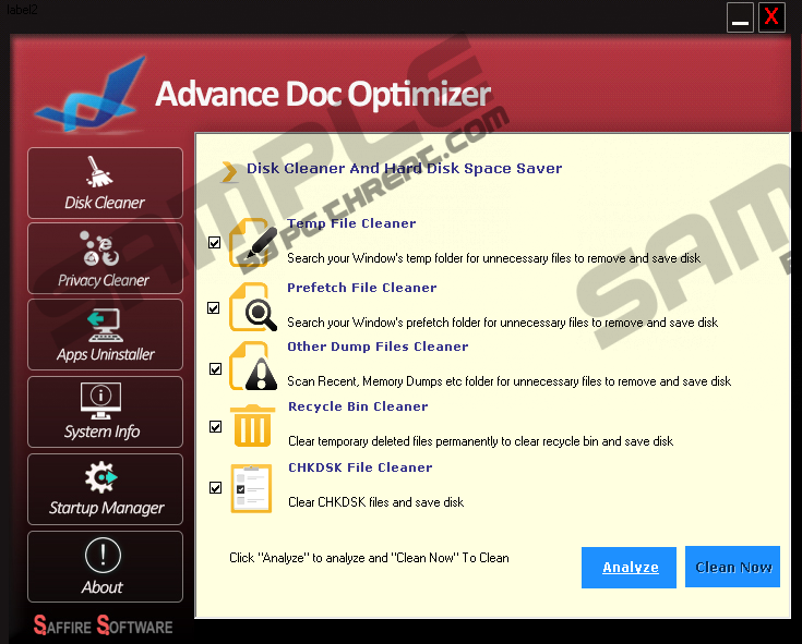 Advance Doc OptimizerAdvance Doc Optimizer is a suspicious system optimizer that is introduced to Windows users by a questionable company named “Saffire Software.” This suspicious company has set up one website, saffiresoftwares.com/products.html, to showcase all of its products, which include Doc Backup, Reg Doc Pro, Doc Driver Updater, Malware Doc Pro, Saffire Disk Powerup, and, of course, the potentially unwanted program (PUP) that we are discussing in this report. These products are not represented in a clear manner, and that is a signal that you are not meant to understand them completely. The home page of the download source informs that the PUP can provide you with an “All In One PC Optimization Suite,” but no real features are listed or discussed. In fact, just by looking at the website, you would think that it is not fully completed yet. Well, it was most recently updated in 2016, and so that is not the case. It is more likely that this website was set up to make Saffire Software look more authentic and trustworthy, when, in reality, it is not all that, and users should consider deleting it. Continue reading, and you will understand why you must delete Advance Doc Optimizer. Although the official download site does not offer a working installer – which is meant to be free – it is likely that this potentially unwanted program is spread via third-party sources. You could find it bundled with more attractive programs promoted on file-sharing websites, or you could be introduced to it using unreliable pop-ups and advertisements. Whatever the case might be, if Advance Doc Optimizer is active on your operating system, you MUST scan your operating system immediately because the chances are that you will need to delete other infections; along with the PUP, of course. So, why exactly is this program considered to be unreliable? That is because it does not work that great. It might detect temp files, empty registry entries, recycle bin items, and other elements that do not really affect the performance of the operating system. While it certainly does not hurt to remove these components, you do not want to pay money for this service because you actually can easily clean your operating system in this manner yourself. It is much more important for you to invest in software that can guard your operating system against malware or help you remove actual infections. The company that has created Advance Doc Optimizer does not have a signature, and that is a bad sign. The Privacy Policy representing this PUP informs that the company uses tracking cookies to record information about you. Most of this data is likely to be non-personally identifiable, but even if data does not reveal sensitive information, you still do not want it being recorded by an unreliable company. If you decide to pay for the services of Advance Doc Optimizer, the personal information you enter could be recorded. This information includes email address, full name, country, and credit card information, which includes number, expiration date, and the security code. Do you really want to disclose this data? More importantly, do you really want to invest in a tool that does not really work all that great? At the time of research, the PUP was offered for 66,48 USD, and that is a lot of money for something that deletes cookies, temp files, and items placed in the recycle bin. When the mysterious Advance Doc Optimizer is installed onto your PC, it creates a file named “Apps” in the %LocalAppData% directory. Although it should be enough to uninstall the PUP via the Control Panel, we recommend checking the directory to see if all components were successfully removed. Another thing you can do is run a full system scan because you want to know if you have deleted Advance Doc Optimizer or other threats you were after successfully. Another option would be to install anti-malware software. It can delete PUPs, Trojans, rogues, ransomware, adware, hijackers, malicious cookies, and other kinds of threats that might be targeting your operating system. Most important, it can ensure that your operating system is no target at all by enabling full-time protection. Do you know what to do? Hopefully, you do, but if you still have questions, do not hesitate to leave a comment below. Advance Doc Optimizer Removal