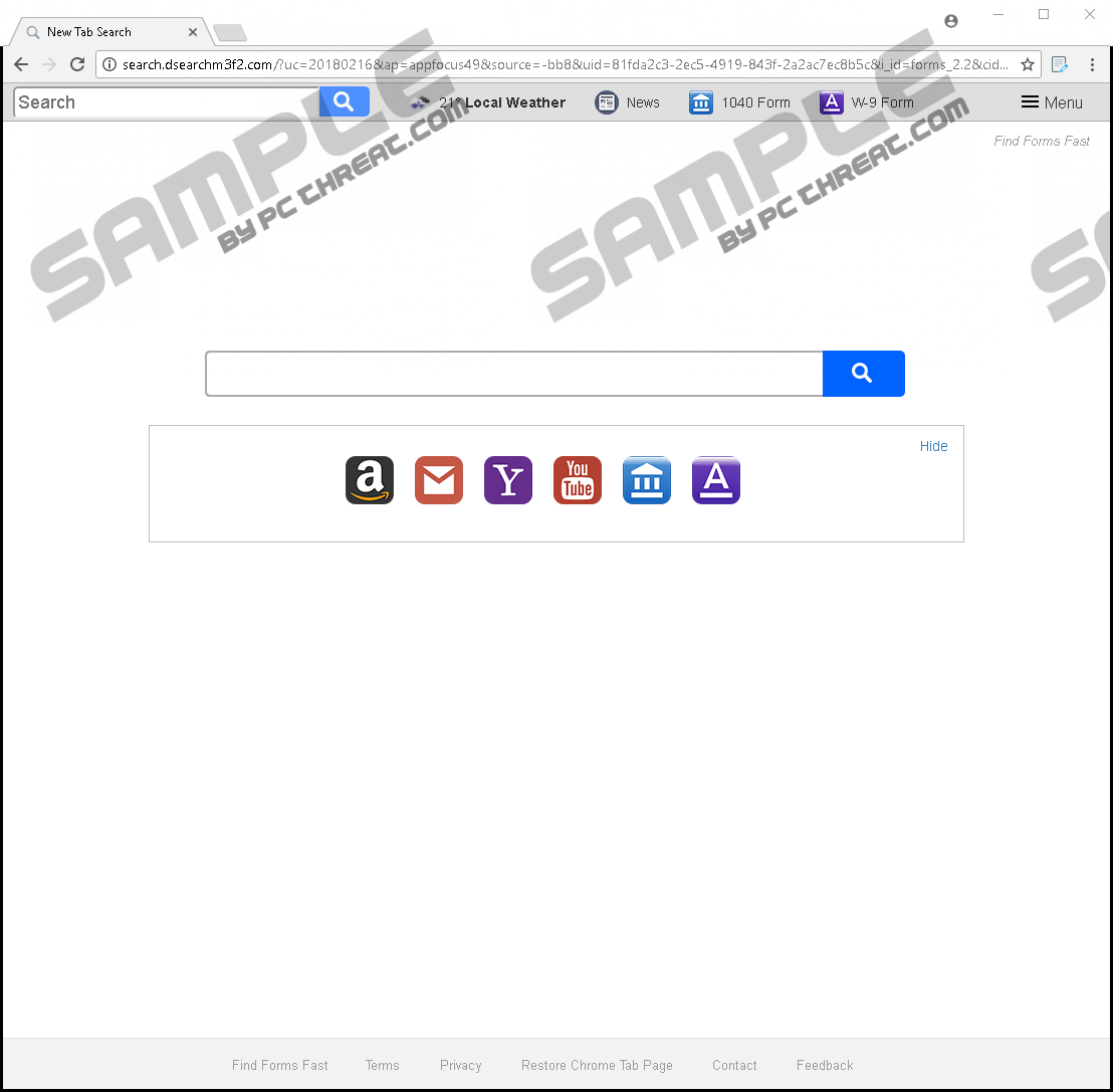 Search.dsearchm3f2.comSearch.dsearchm3f2.com is yet another program that could be quite confusing. When we deal with keywords that have a hyperlink in them, it is usually a browser hijacker that we have to remove from our systems. However, in this case, our research team says that this application is a potentially unwanted program, and the search engine is part of its setup. If by any chance, you want to keep the application that is responsible for changing your search engine, you can do it, but you should seriously consider removing Search.dsearchm3f2.com from your browser. The program that uses this search engine is called Find Forms Fast. It is a potentially unwanted program, so it means that it might get installed on your computer accidentally. While it is possible to download the application from its official homepage, it is far more likely that users download and add these applications to their systems via third-party installers. That is not surprising because potentially unwanted programs tend to come bundled in software packages. When you download freeware apps from file-sharing websites, you have to keep in mind that there might be a lot of additional programs that come with them. Consequently, Find Forms Fast might be one of them. What’s more, Find Forms Fast can also be found at the Chrome Web Store. This means that the application does not hide from you at all. It is available in plain sight, and you can choose whether you want it on your PC or not. Although this program functions as an extension on the Chrome browser, the search engine that comes with it can equally affect all the other main browsers, too. Hence, there is a bigger chance that you will have to deal with it if the application comes in a software bundle. According to our research, Search.dsearchm3f2.com is very similar to many other search engines out there that are also often considered browser hijackers. For instance, we can tell that Search.yourpackagesnow.com, Search.yourmapscenter.com, Search.yourclassifiedscenter.com, and a number of other browser hijackers are very similar to Search.dsearchm3f2.com. So whatever we had to go through with the other browser hijackers, we can probably expect something similar from this search engine, too. That is not to say that browser hijackers are extremely dangerous computer infections. In fact, they are more of annoying nuisances than actual system security threats. However, such browser settings modifications should not be overlooked because it can point out a more serious issue. It does not seem that Find Forms Fast would allow you to choose whether you want to add the new search engine or not. The settings on your browser get modified automatically, the moment you install the application. Once the installation is complete, Search.dsearchm3f2.com is set as your default homepage, and it will also function as your main search engine. It might seem that there is nothing odd about it because the search engine looks like your regular domain. Nevertheless, when your browser’s settings are changed like that, it is very likely that your browsing sessions get monitored. Now, what can happen when your browsing sessions get monitored via tracking cookies? For the most part, you will see more commercial advertisements related to your likes and preferences. Search.dsearchm3f2.com merely wants to make some money via third-party advertising. However, such search “providers” do not check the third-party content they promote. Hence, it is possible for a malevolent third party to make use of the program’s advertising network for malicious content distribution. In other words, you could end up clicking a link that leads you to a dangerous website. For there, you would be only one click away from a malware infection. To protect yourself and your personal information from malicious exploitation, you need to remove Search.dsearchm3f2.com today. As mentioned, you can simply remove the search engine without deleting the associated application (in case you are using it). However, computer security specialists would like to emphasize that all potentially unwanted programs should be uninstalled from your computer if you wish to avoid various threats in the future. After manual removal, you will do yourself a favor if you run a full system scan with a powerful antispyware tool. After all, you need to make sure that no other unwanted application entered your PC. How to Remove Search.dsearchm3f2.comInternet Explorer