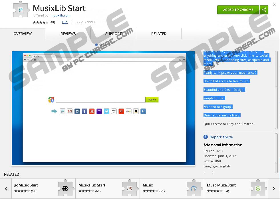 MusixLibMusixLib is advertised as a “new Chrome extension for a quick music click-and-visit experience.” Users are told that they could play albums of their favorite artists for free and will get unlimited access to music if they install this piece of software on their computers. Unfortunately, some users consciously install it on their computers. It can be downloaded directly from the Chrome Web Store https://chrome.google.com/webstore/detail/musixlib-start/ifhnjalcekbmmeknpgnkpghldbbhanen or its official website http://www.musixlib.com. What those users who install it on their PCs willingly do not know about it is that it is a potentially unwanted program, or PUP. If you have installed MusixLib yourself too but do not like how it works, you should delete it right away. We suggest that you get rid of it if it has been installed on your computer without your knowledge as well. MusixLib is not anything near harmful malicious software, so you should not find its removal complicated. Of course, if two words “add-ons manager” do not tell you anything, you should read this report first before going to delete MusixLib from your system. MusixLib promises to improve users’ experience and provide unlimited access to free music. It does seem to be beneficial software at first sight, so we are sure that some users install it on their PCs themselves consciously. Unfortunately, they do not find this piece of software very useful. Our specialists do not consider it very beneficial software either because research conducted by them has clearly shown that MusixLib only sets a new page as a homepage and New Tab. Your default search tool will be left unchanged, but you will still see the page set by this potentially unwanted application each time you launch your Google Chrome browser. Luckily, it is compatible with this only browser, so your other browsers will not be affected. The page promoted by MusixLib looks like an ordinary search provider at first glance. It contains a search box that returns search results when users enter search queries. In addition, it contains the so-called quick-access buttons that open popular websites. You do not need to have MusixLib installed to be able to access them. You can open them by typing their URLs in your browser’s address bar. In addition, specialists say that you might see some modified search results if you perform web searches using the search tool set by the MusixLib potentially unwanted application. Last but not least, it is very likely that some details will be recorded about you automatically if this piece of software stays active. Your search queries and links you click will be recorded as well if you use its search tool. If you do not like something about this browser extension, you can erase it at any time. Consequently, it will no longer perform any activities on your system. Some users install MusixLib directly from the Chrome Web Store or its official website with the single click, but we are sure there are still more people who cannot explain how and when this piece of software has been installed on their computers. Our researchers confirm that it might enter users’ PCs and affect their browsers without their knowledge because research has revealed that it might travel bundled together with other applications. Since users tend not to read the information provided for them, they agree with the installation of suspicious software without even realizing that. It is not the only way MusixLib is spread. Specialists say that it might be promoted via pop-ups too. They are usually displayed to users when they open specific websites promoting software; however, if you see various ads on your screen periodically, you might have an advertising-supported application active on your system. If you can locate it on your PC, remove it mercilessly as well. MusixLib is far from dangerous malware, so its removal will not be very complicated. All you need to do is to open the add-ons manager, locate this extension, and then click the button with the Trash symbol. Our instructions (find them below this paragraph) will help you to eliminate it, but you should know that you can delete all undesirable applications automatically as well. To do this, you need to acquire a powerful antimalware scanner, install it, and then simply launch it. Remove MusixLibGoogle Chrome