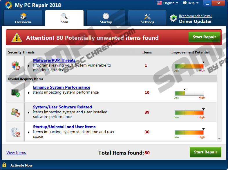 My Pc Repair 2018My Pc Repair 2018 is presented as a useful PC optimization tool that will improve the computer’s overall performance by detecting and removing clutter. We have to admit that it does look legitimate at first, which is also the reason so many users do not hurry to remove it from their computers, but you should know that it cannot be trusted 100%, so if you ever install/detect it on your system, you should consider getting rid of it as soon as possible. Without a doubt, you will find a similar but more trustworthy application on the web and could install it on your computer instead. Researchers at pcthreat.com say that judging from the same signature used, My Pc Repair 2018 might be associated with Win Boost Pro 2018, Dr.Clean Pro 2018, and other applications. To be more specific, it is very likely that they all share the same author. Because of this, we do not think that these other applications could be trusted 100% as well, so do not install any of them after you uninstall My Pc Repair 2018. We are sure users find it hard to understand why this piece of software is not considered fully reliable when it does not differ much from legit tools the way it looks. Let us explain you why it has been categorized as a potentially unwanted application in the next paragraph. It takes time to realize that My Pc Repair 2018 is not 100% reliable software. In fact, some users never find out that it cannot be fully trusted. We do not blame those users who still think that it is decent software after installing it on their computers because this application automatically starts a system scan once installed and then lists found potentially unwanted items affecting the computer’s performance in a negative way. It lists a number of found malware/threats, items impacting performance, items that have an impact on the performance of the system and software installed by the user, and items that impact startup time and hard disk space. We cannot promise that all listed items affect your PC’s performance, but there is no doubt that users could not repair/remove them by simply clicking the Start Repair button. You will see for yourself that you need to upgrade the program first. Its price is EUR 23.95, but you may be offered a 50% off discount when you try to leave the payment page. Yes, it is quite cheap if compared to other PC optimization tools, but it does not mean that you should purchase the license of My Pc Repair 2018. It is never a good idea to invest in potentially unwanted programs. In addition, we cannot guarantee that this application could really remove clutter and boost your computer’s speed. Users might come across an official website of My Pc Repair 2018, but, according to our researchers, the majority of users cannot even explain why this piece of software is installed on their computers, which clearly shows that it might be distributed in software packages together with other programs. As has also been observed, My Pc Repair 2018 offers to install Driver Updater during its installation, so if you have already installed this potentially unwanted application on your computer, there is a possibility that you have agreed with the installation of additional software as well. Our recommendation for you would be to remove both of them. If you have ended up with untrustworthy software, it is very likely that you keep your PC unprotected. If you do not do anything about this soon, you might encounter a new untrustworthy application in the near future, and it might be more harmful than potentially unwanted software. You will find My Pc Repair 2018 entry in Control Panel, but it has turned out that it leaves some leftovers, meaning that you will need to delete them yourself or use an antimalware program to delete this program from the system automatically. If you choose the manual removal method over the automatic one, follow our step-by-step instructions and make sure you do not leave a single component of this potentially unwanted program. If it is not removed fully, it might have a chance to continue performing activities on your system. Delete My Pc Repair 2018Windows XP