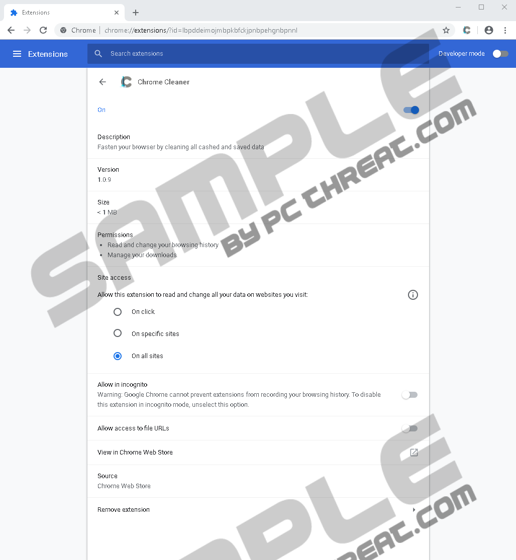 Chrome CleanerDid you download Chrome Cleaner onto your Google Chrome browser hoping that it could make it easier for you to clear it? That is exactly what you are supposed to believe, and the information accompanying the installer on the Chrome web store (chrome.google.com/webstore/detail/chrome-cleaner/lbpddeimojmbpkbfckjpnbpehgnbpnnl/) supports the notion. According to the information, the extension – which we classify as a potentially unwanted program/PUP – can clear cached data, protect your privacy, and delete all activity. It is stated that this can improve the speed of the browser, and so some users might be lured in. At the time of research, over 67,000 users had downloaded the PUP from the Chrome web store, and the app had a positive 4.3* rating from 212 reviewers. That being said, although the extension looks legitimate and even beneficial, there are several reasons why we advise removing Chrome Cleaner right away. If you are interested and want to learn more, keep reading. If you downloaded Chrome Cleaner from the Chrome web store, you should have noticed that the PUP is, allegedly, offered by “ccleaner.” However, no external links are offered, and so it looks like an official download page does not exist, and we could not track a website representing the developer either. One thing is for sure – the PUP is NOT related to CCleaner by Piriform in any way. Needless to say, the Chrome web store might not be the only source representing the suspicious extension. In fact, analysts in our research team have found that the program could be distributed via unreliable bundled installers, and its name could be modified too. “CCleaner” is one of the names that could represent the same program. Obviously, if you downloaded the potentially unwanted program using an unfamiliar source, it is crucial to scan the system to check if other threats were not installed. If they were, you need to delete them immediately, especially if they are more dangerous than the PUP itself. Hopefully, you can find removal guides on our website, but if you cannot, do not hesitate to post a comment below. Even if you downloaded Chrome Cleaner willingly and on its own, this extension cannot be trusted. First and foremost, legal information is NOT available, and that means that you cannot know how this program records information, what parties it works with, or what kinds of privacy and security guidelines it follows. Although this might seem like a minuscule detail to some, our research team indicates that this might be the top reason to delete Chrome Cleaner from your operating system. The services of this extension are not beneficial either. Once you install it, you will find a button at the top of the browser, and if you click it, you will find “History,” “Cache,” “Downloads,” “Cookies,” “Website Storage,” “Passwords,” “Memory,” “Extensions,” “DNS,” and “Incognito” buttons. Does this sound familiar? That is because all of these tools are already available to you on your browser. For example, if you want to delete web cookies or clear browsing history, you can do it via the chrome://settings/clearBrowserData menu. “Incognito” mode can be turned on by taping keys Ctrl+Shift+N. To put it simply, the extension is neither beneficial nor trustworthy, and so we recommend deleting it. If you do not know how to delete Chrome Cleaner from your browser, you can follow the instructions below. They show where to find the extension and how to eliminate it. Our instructions also show how to clear browsing data, and you should not skip this step because you do not know what kinds of cookies could have been placed to track your activity and record information about you. Obviously, if other threats exist, you want to think carefully if you should tackle every single one of them individually. Depending on the threats you face, it might be easier and more convenient to employ anti-malware software. It will quickly remove Chrome Cleaner along with everything else that deserves it, and then it will continue protecting you against PUPs and dangerous malware in the future. Chrome Cleaner Removal